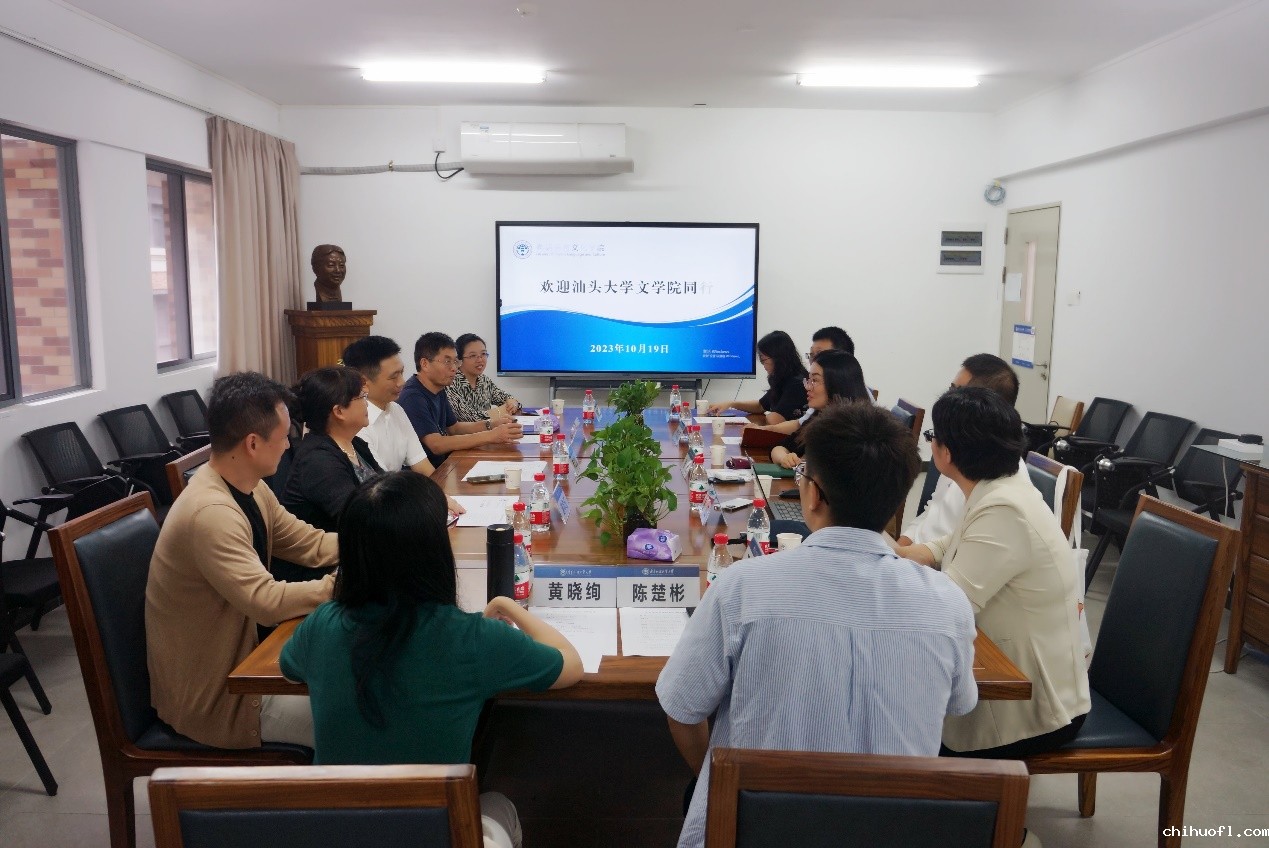 本网讯 2023年10月19日下午,汕头大学文学院院长毛思慧、副院长李杰、外文系主任谌华玉、外文系副主任杨婧媛、外文系泰语专业负责人杨劲、外文系教学秘书黄晓绚等一行来英文学院进行工作调研交流。我院院长张欣、副院长吴庄、李成团、党委副书记王迪、英语教学部主任胡潇译和辅导员陈楚彬参加调研座谈会,会议在一教北446会议室进行。张欣院长主持会议。