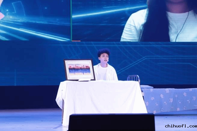 该剧目以小见大,以一个家庭的缩影折射整个人类社会。因此,配合故事叙述,舞台设计将科幻与温馨相结合,既符合未来设定,又能传达主题。剧目舞台设计十分精细,多数道具为手工制作。房间内的四朵以蓝紫色为主调的纸艺飞燕草花,既增添了家庭的温馨感,也突出了科幻感。该剧目追求动态呈现科幻题材,在背景和音效上融入科技元素;也追求戏剧美态表达,多次用花隐喻人类与机器人间的关系,为观众带来了一场极具美感的科幻视觉盛宴。