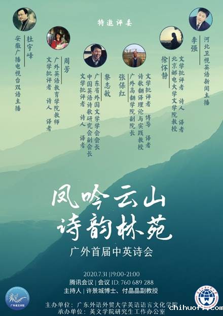 本网讯 2020年7月31日,由xk星空官方网站主办、学院研究生工作办公室承办的首届广外“凤吟云山诗韵林苑”中英诗会在腾讯会议平台顺利举办。广东外国文学学会会长黎志敏教授、北京邮电大学文学院徐怀静教授、安徽广播电视台双语主播杜宇峰先生、河北卫视英语新闻主播李强先生、广东外语外贸大学高级翻译学院副院长张保红教授、广东外语外贸大学英语教育学院教师周芳博士等六位专家评委,以及英文学院院长张欣、党委书记林绍雄、研究生工作办公室主任焦敏等领导、老师和70多名学生出席了本次诗会。此次诗会由英文学院英美文学系教师许景城博士、付晶晶副教授主持,以“锵锵多人行”形式开展和推动赛事。