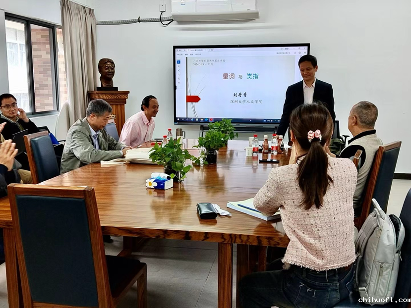 2024年3月19日上午,由广东外语外贸大学英文学院主办的学术讲座在白云山校区第一教学楼北楼446会议室举行。本场讲座主讲嘉宾为深圳大学特聘教授、中国社会科学院语言研究所原所长、《中国语文》原主编、著名语言学家刘丹青教授,讲题为“量词与类指”。讲座由英文学院魏在江教授主持。我院副院长李成团教授,外国语言学及应用语言学研究中心研究员石定栩教授、胡建华教授、马志刚教授,中文学院严修鸿教授,以及来自各学院(研究中心)的师生参加了本次讲座。讲座前,英文学院院长张欣教授、副院长李成团教授会见了刘丹青教授。
