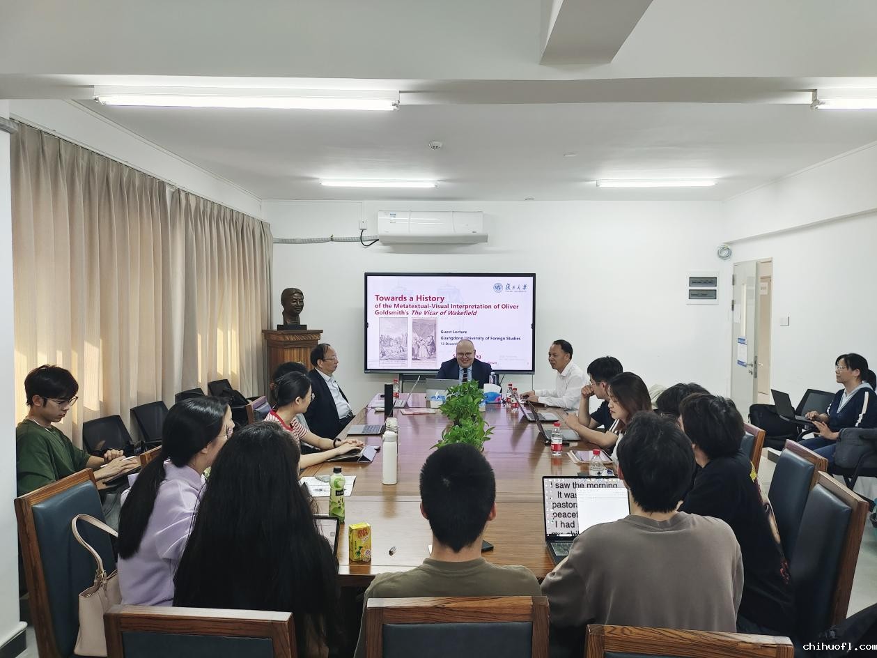 本网讯 12月15日下午,由我院主办的学术讲座“奥利弗·戈德史密斯小说《威克菲尔德牧师传》元文本视觉阐释史(1767-1802)”在白云山校区第一教学楼北楼446会议室顺利举行。复旦大学外国语言文学学院特聘教授、文本文化研究中心主任、国际期刊ANQ主编Sandro Jung教授担任主讲嘉宾,刘茂生教授主持,外国语言文学学科“云山工作室”首席专家傅修延教授出席,来自校内外的数十名师生到场积极参与交流。