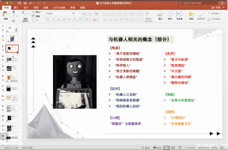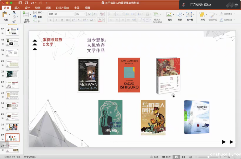 接着,程林老师以科幻题材的价值和机器人这一重要科幻人文核心概念展开讲座,点明了选择机器人人文概念讲解的原因。他认为:一方面,机器人是科幻传统种类之一,在科幻题材中占据重要部分;另一方面,机器人在当下热度不减,相关作品较多,能为同学们的主题创作、戏剧设计提供启发。并且,他巧妙地引用了“早八机器人”、“论文机器人”等热词来引发与会同学的思考。