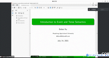 7月14日上午,英文学院在腾讯会议平台举办了题为“Introduction to Event and Tense Semantics(事件与时制语义)”的线上讲座,学院2018级和2019级的50余位同学与来自各院校的师生参加了此次讲座。主讲人是华中农业大学外国语学院英语系副系主任徐贝贝老师,主持人是我院李昊泽老师。徐老师本科与硕士就读于复旦大学英文系,并在美国罗格斯大学取得语言学博士学位,曾任教于普林斯顿大学和海南大学,现为华中农业大学外国语学院副教授、英文系副主任。