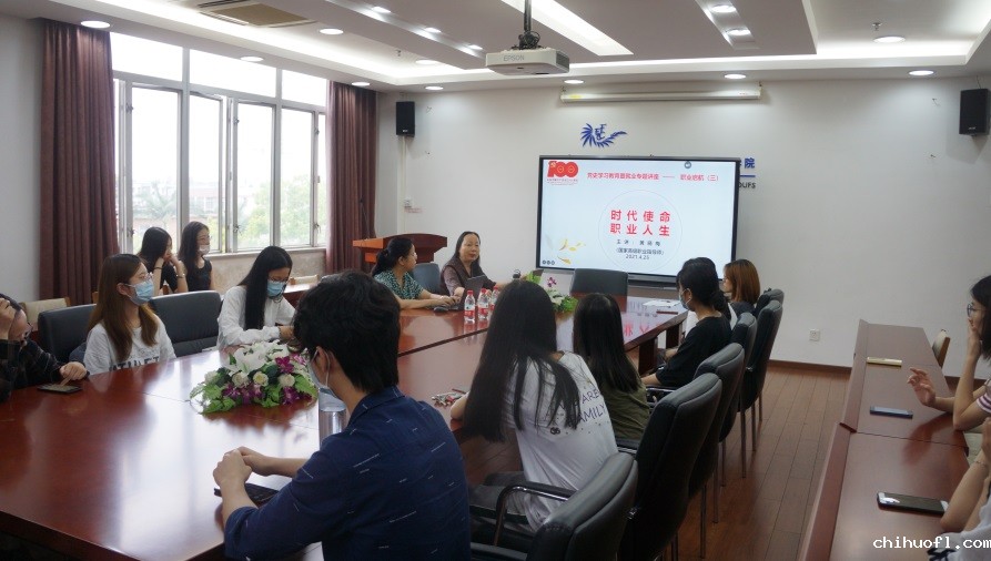 2021年4月25日星期日下午,英文学院于七教412会议室举行党史学习教育暨就业专题座谈会。座谈会主题为“时代使命 职业人生”,由英文学院党委副书记黄晓梅主讲,许勉君教授以及英文学院高翻方向的近三十名就业对口帮扶学生参加此次座谈会。