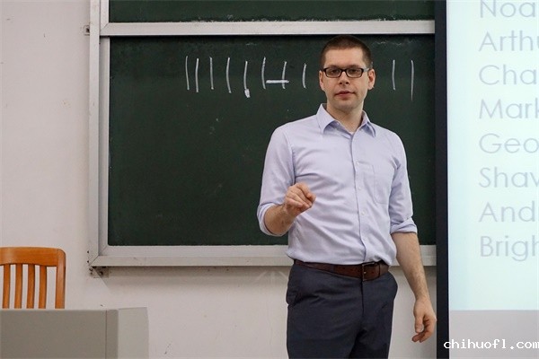 本网讯 4月7日晚七点,以“Twenty Incredible Facts about English and its Development”为主题的讲座在二教116室成功举行。此次讲座为我院优秀外教Joshua Isaacs主讲的系列讲座中的第二场。他以幽默风趣的语言介绍了英语发展的趣味历史,从英语字母的形成、单词语句中的多文化混合等多个角度为同学们解读了英语不易学习的因由,现场气氛热烈。