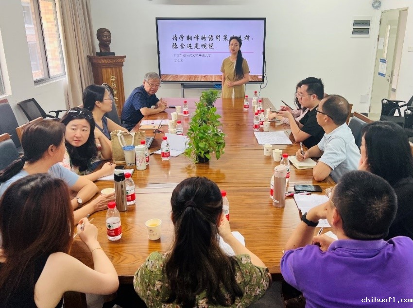 在交流会结束后,王东风教授做了一场题为《诗学翻译的语用学策略选择:隐含还是明说?》的学术讲座。本讲座主要围绕诗学翻译中的语用学策略。在王教授看来,诗学翻译应遵循诗学的原理,以尽可能地再现原文的文学性及蕴含其中的诗学功能为其主要目标。他在讲座中引用了结构主义诗学的领军人物雅各布森有关诗学的观点,即诗学是运用语言学来研究文学语言的学问,因此诗学是语言学的一个组成部分。他从语言学的角度,反观诗学对文学性和诗学功能的界定是否合理,诗学的理念是否适合于文学翻译,认为这是一个一直被忽略的问题。接着他从语用学的角度,以丰富的案例探讨了诗学翻译的合理性和可行性。