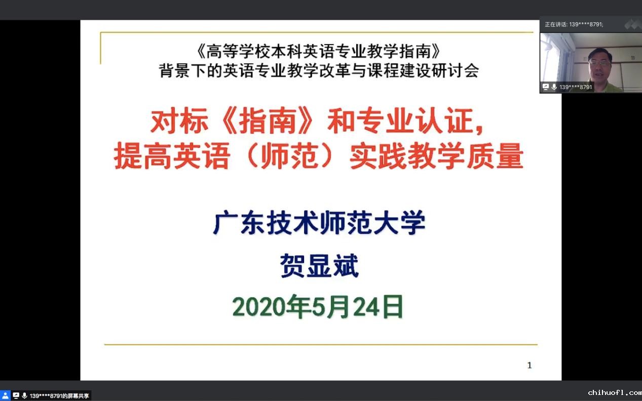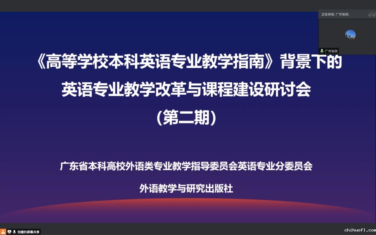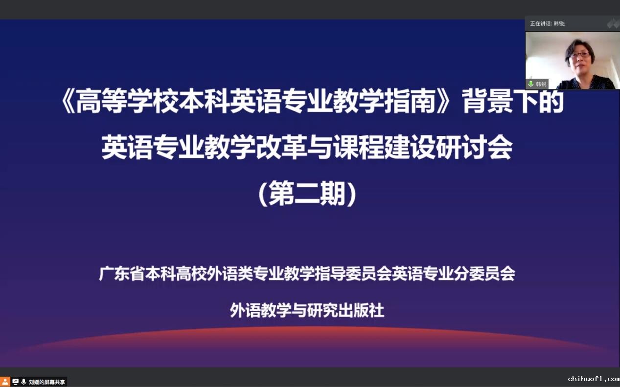 本网讯 5月24日上午,“《高等学校本科英语专业教学指南》背景下的英语专业教学改革与课程建设研讨会”第二期顺利召开。在继第一期对《指南》的权威解读之后,第二期会议着重于“广东省高校英语专业指南落地分享和交流”。广东省本科高校英指委邀请了xk星空官方网站欧阳护华教授、北京师范大学珠海分校外国语学院院长陶文好教授、南方医科大学外国语学院院长李清华教授以及广东技术师范大学外国语学院院长贺显斌教授,与大家分享了不同类别院校各具特色的专业发展和课程建设方面的实践和思考。广东省本科高校英指委主任委员、xk星空官方网站张欣院长在会上致辞,广东省本科高校英指委秘书长、xk星空官方网站副院长韩锐副教授主持了本次会议,全国各高校近300名英语专业教师参加了此次线上的研讨交流活动。