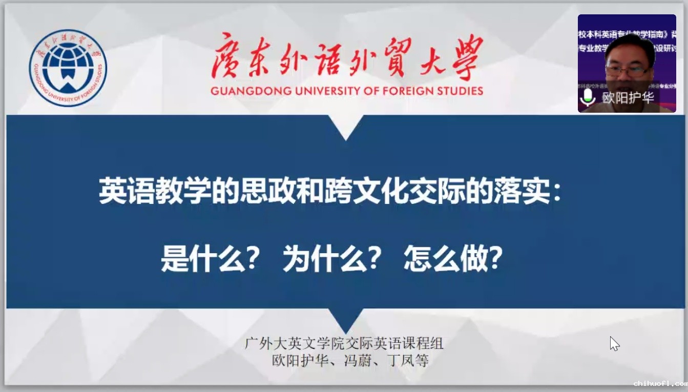 本次研讨会通过专家发言、互动答疑等方式,引领高校英语教师们共同探讨了《指南》所要求的课程思政和分类发展等话题。欧阳护华以广外《新交际英语》为例,分享了如何在英语课程中搭建起英语语言文化与中国文化的比较框架,将思政教育与跨文化交际能力培养相结合,增加学生对自身文化的了解,增强文化自信。陶文好介绍了北师大珠海分校英语专业教育模式的改革经验和规划,双语种、双专业和双学位的多元化培养方向以及一整套具有中华元素的英语专业课程体系的打造,都是特色和亮点。李清华介绍了医科院校英语专业的特点,致力于打造一流医学英语专业,培养既具备扎实英语语言文化基本功、又掌握一定医学基础理论与知识的跨学科医学语言服务人才。贺显斌围绕英语师范专业的交叉属性,介绍了英语《国标》和《指南》与师范专业认证标准如何相结合,并分享了广东技术师范大学在实践教学方面的经验。专家们也分别就在线听众提出的有关问题进行了解答。